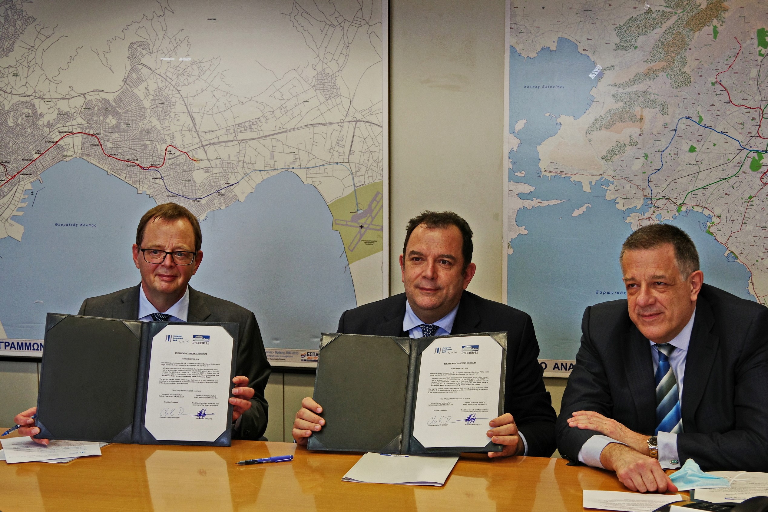 Σήμερα, στα κεντρικά γραφεία της εταιρείας, η Αττικό Μετρό Α.Ε., σε συνεργασία με την ηγεσία του Υπουργείου Υποδομών και Μεταφορών, του Υπουργείου Οικονομικών και τους αρμόδιους φορείς, ολοκλήρωσε όλες τις διαδικασίες που απαιτούνταν για τη σύναψη της Σύμβασης, η οποία υπεγράφη παρουσία των κ.κ. Christian Thomsen, Αντιπροέδρου της ΕΤΕπ, Ιωάννη Καλτσά, Επικεφαλής της Ομάδας Επενδύσεων της ΕΤΕπ για την Ελλάδα, και Νικολάου Κουρέτα, Διευθύνοντα Συμβούλου της Αττικό Μετρό Α.Ε.