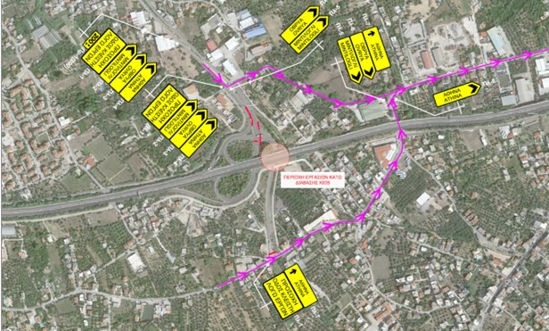 Στο διάστημα αυτό, οι τοπικές κινήσεις στην περιοχή του κόμβου της Οβρυάς θα εξυπηρετούνται από τις γειτονικές Κάτω Διαβάσεις, ενώ η κίνηση μέσω του κλάδου εισόδου του κόμβου Οβρυάς προς Αθήνα, θα πραγματοποιείται μέσω του κόμβου του Γλαύκου, όπως φαίνεται στο ακόλουθο σχηματικό διάγραμμα.
