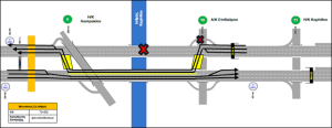 - Θα υλοποιηθεί αποκλεισμός του αριστερού κλάδου (προς Αθήνα) και θα διαμορφωθεί αμφίδρομη κυκλοφορία στον δεξιό κλάδο (προς Κόρινθο), σε μήκος 1 χλμ. (από ΧΘ 75,2 έως ΧΘ 76,2).
