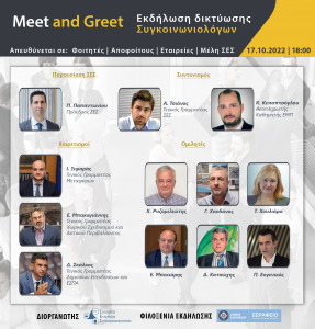 Ο Σύλλογος Ελλήνων Συγκοινωνιολόγων σε συνέχεια των δράσεων για την δικτύωση των μελών του και την ενημέρωση των νέων συναδέλφων για τις επαγγελματικές προοπτικές, διοργανώνει τη Δευτέρα 17 Οκτωβρίου 2022 Εκδήλωση Δικτύωσης στο Σεράφειο του Δήμου Αθηναίων που βρίσκεται στην (Εχελιδών 19 & Πειραιώς 144)